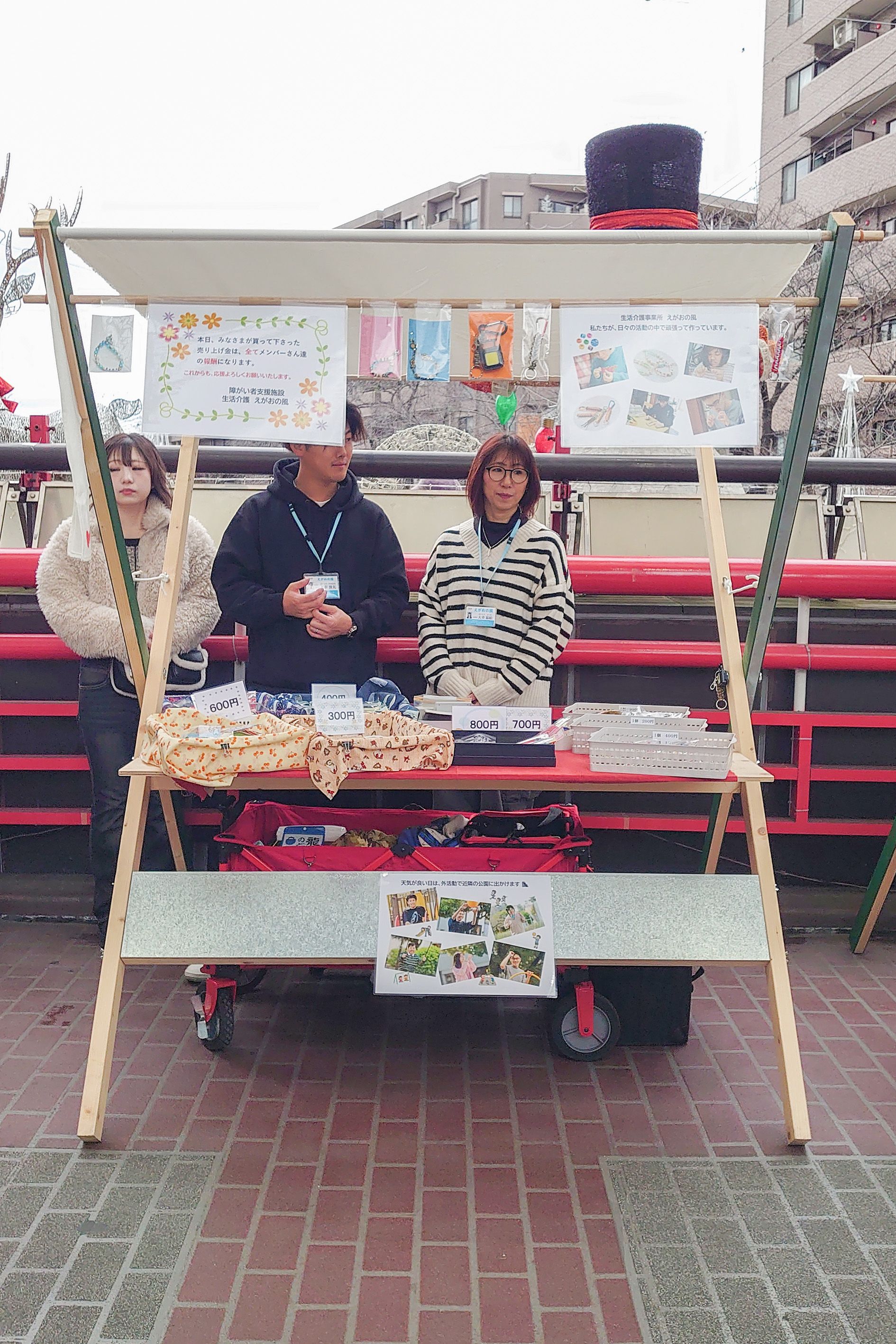 202512.29 12月21日(日) 弘明寺商店街「橋の上 市場」出店しました 天気予報の雨マークが消えず☔お天気が心配で、中止になるのか?開催できるのか?ドキドキでした。前日に、出店キャンセルのお店が7~8店舗ほどあり・・・😣職員一同、祈りました・・・☀神様ありがとう♡「橋の上 市場」に初出店できました🎉🎉🎉主催者の代表の方が、親切に色々とアドバイスを下さり、大変、勉強になりました。えがおの風のメンバーさんに、報酬もお渡しする事が出来ました💛また、是非、参加させて頂こうと思います。